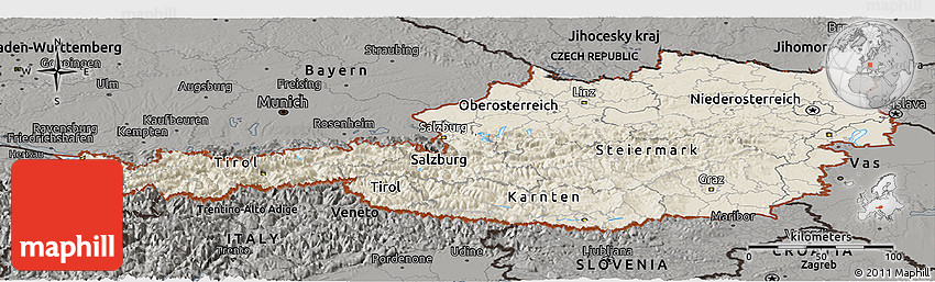 The value of Maphill lies in the possibility to look at the same area from several perspectives. Maphill presents the map of Austria in a wide variety of map types and styles.