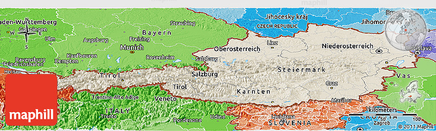The value of Maphill lies in the possibility to look at the same area from several perspectives. Maphill presents the map of Austria in a wide variety of map types and styles.