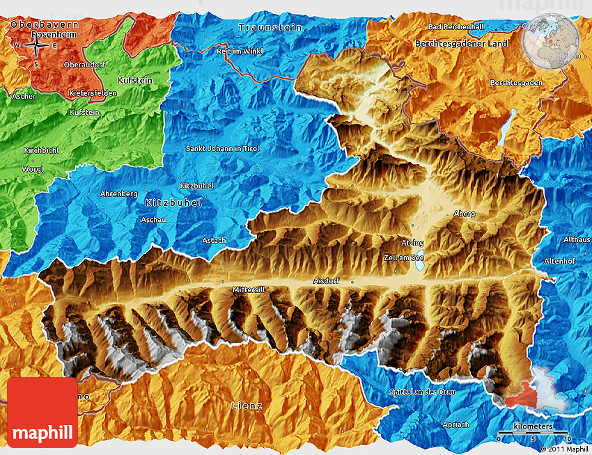The 3D physical map represents one of several map types and styles available. Look at Zell am See, Salzburg, Austria from different perspectives.