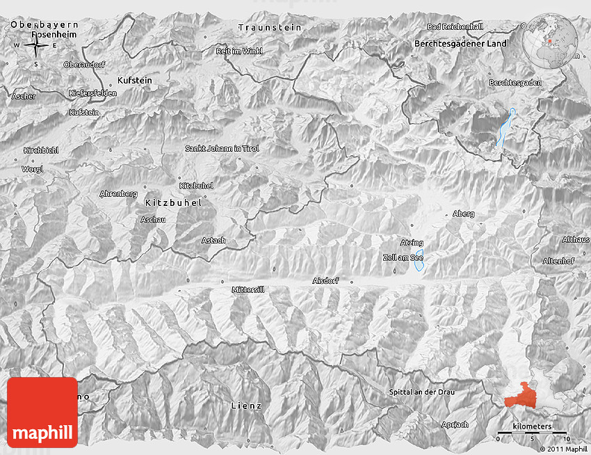 The 3D silver style map represents one of several map types and styles available. Look at Zell am See, Salzburg, Austria from different perspectives.