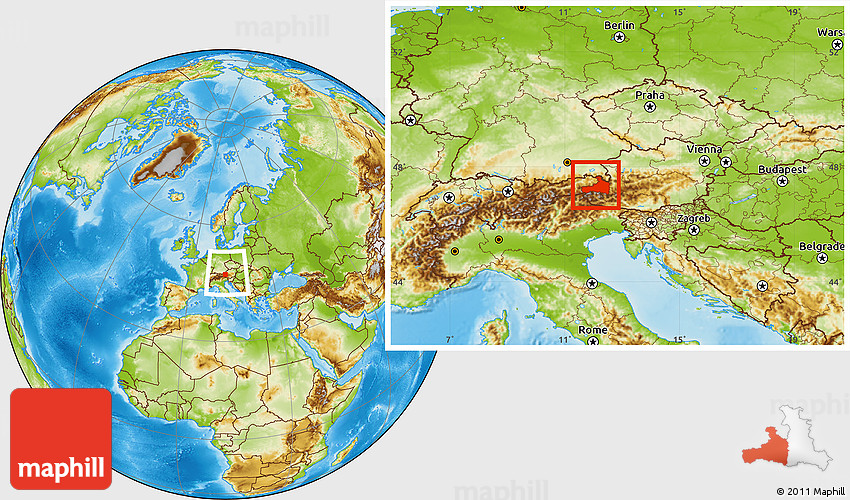 Maphill is a collection of map images. This image combines a physical map with the globe centered on Zell am See. Use the buttons under the image to switch to different map types.