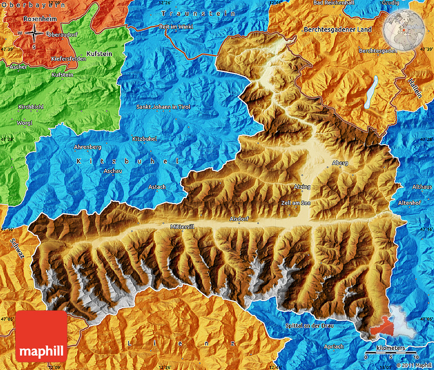 Physical map illustrates the mountains, lowlands, oceans, lakes and rivers and other physical landscape features of Zell am See. Differences in land elevations relative to the sea level are represented by color.
