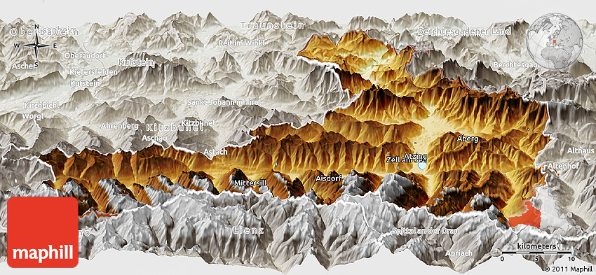 The panoramic physical map represents one of several map types and styles available. Look at Zell am See, Salzburg, Austria from different perspectives.