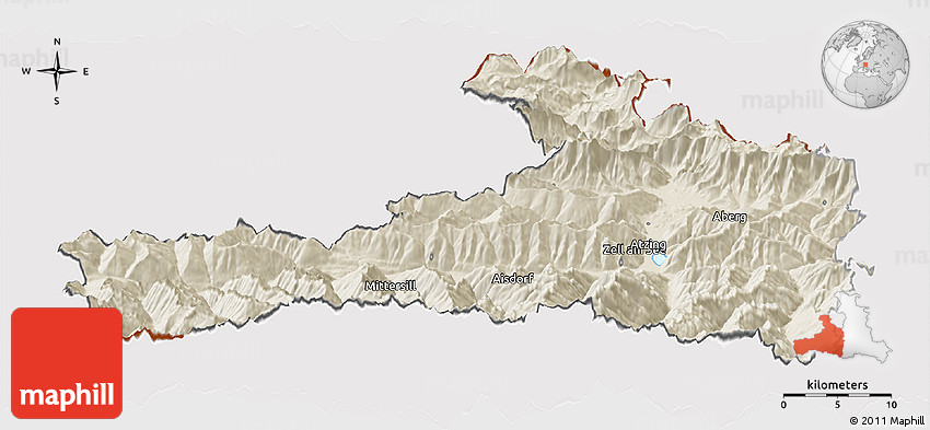 The panoramic shaded relief map represents one of several map types and styles available. Look at Zell am See, Salzburg, Austria from different perspectives.