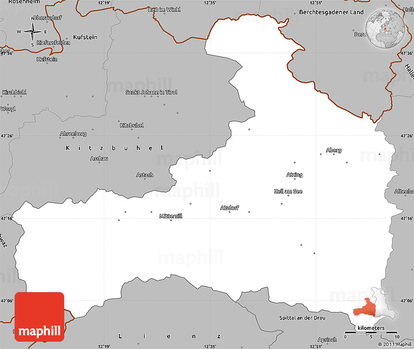 The simple gray outline map represents one of several map types and styles available. Look at Zell am See, Salzburg, Austria from different perspectives.