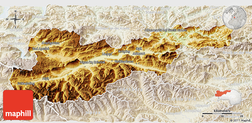 The 3D physical map represents one of several map types and styles available. Look at Liezen, Steiermark, Austria from different perspectives.