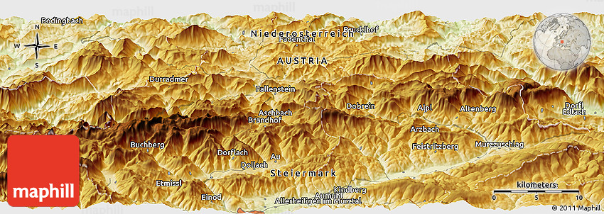 The panoramic physical map represents one of many map types and styles available. Look at Ganz, Murzzuschlag, Steiermark, Austria from different perspectives.