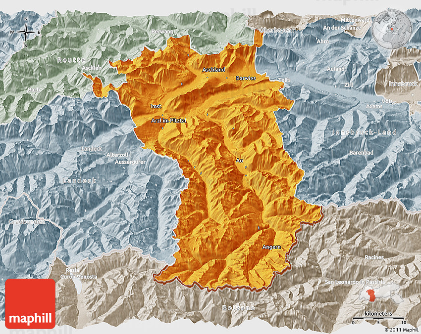 The 3D political map represents one of several map types and styles available. Look at Imst, Tirol, Austria from different perspectives.
