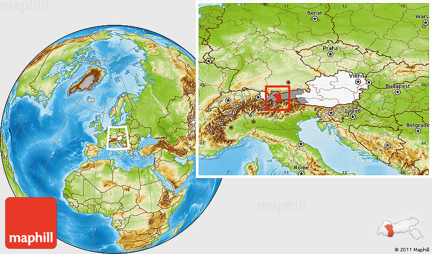 Maphill is a collection of map images. This image combines a physical map with the globe centered on Imst. Use the buttons under the image to switch to different map types.