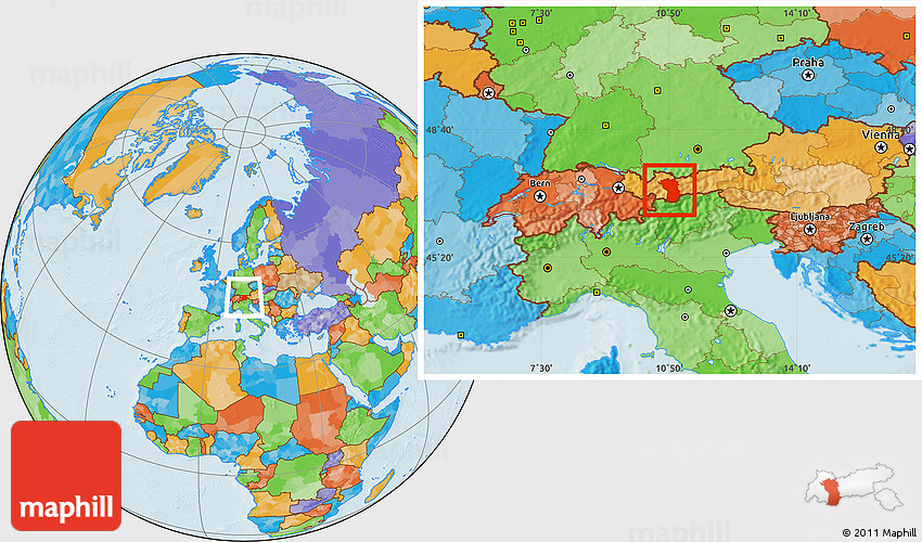 Maphill is a collection of map images. This image combines a political map with the globe centered on Imst. Use the buttons under the image to switch to different map types.