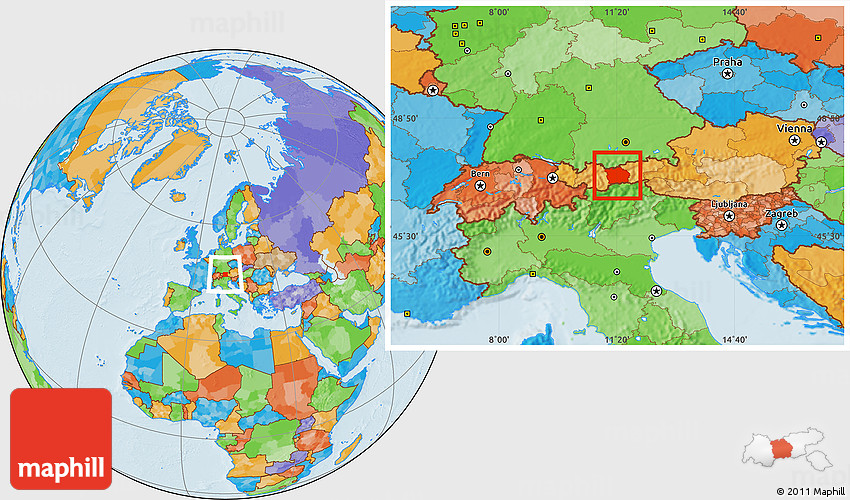 Maphill is a collection of map images. This image combines a political map with the globe centered on Innsbruck-Land. Use the buttons under the image to switch to different map types.