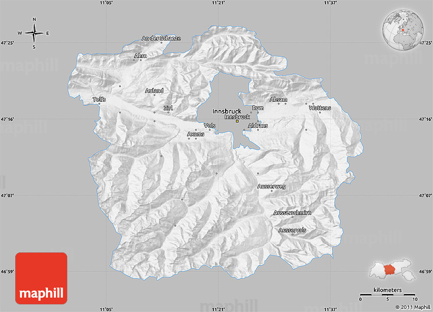 The flat gray map represents one of several map types and styles available. Look at Innsbruck-Land, Tirol, Austria from different perspectives.