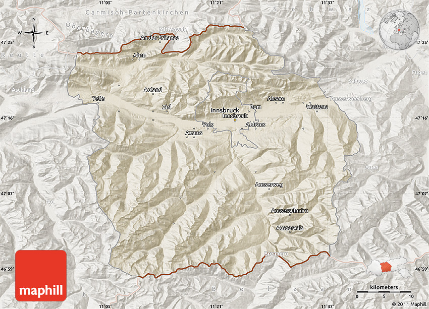 Maphill is a collection of map images. This shaded relief map of Innsbruck-Land is one of them. Click on the Detailed button under the image to switch to a more detailed map.