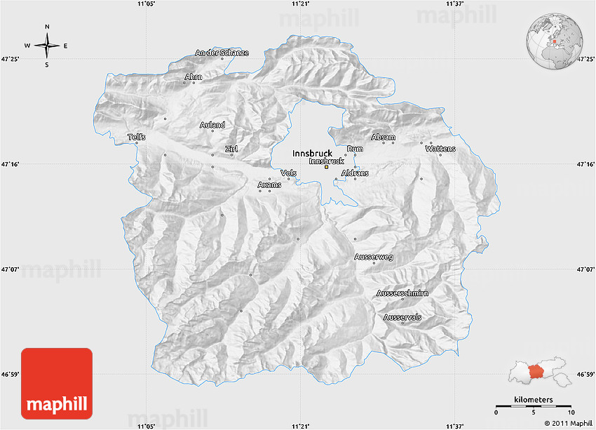 The flat silver style map represents one of several map types and styles available. Look at Innsbruck-Land, Tirol, Austria from different perspectives.