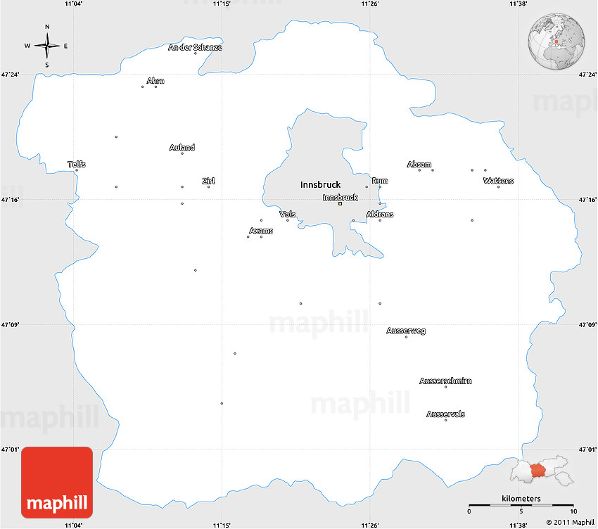 The simple silver style outline map represents one of several map types and styles available. Look at Innsbruck-Land, Tirol, Austria from different perspectives.