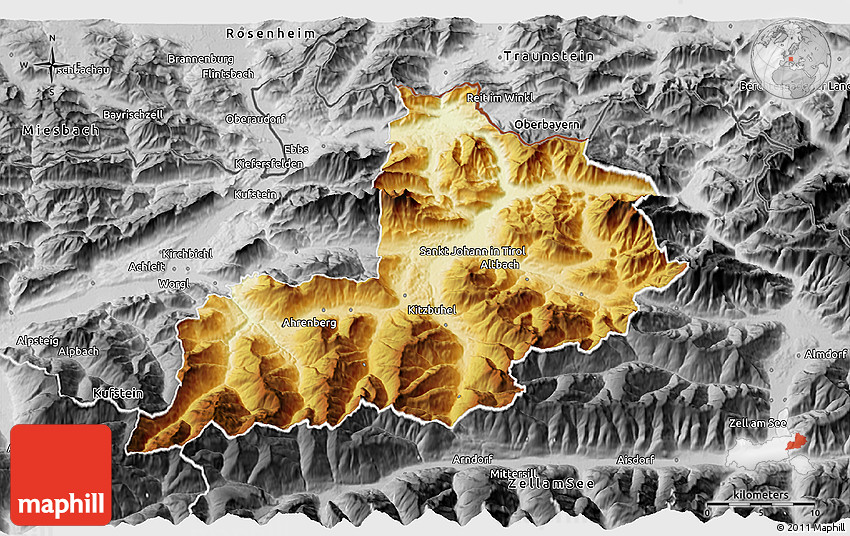 The 3D physical map represents one of several map types and styles available. Look at Kitzbuhel, Tirol, Austria from different perspectives.