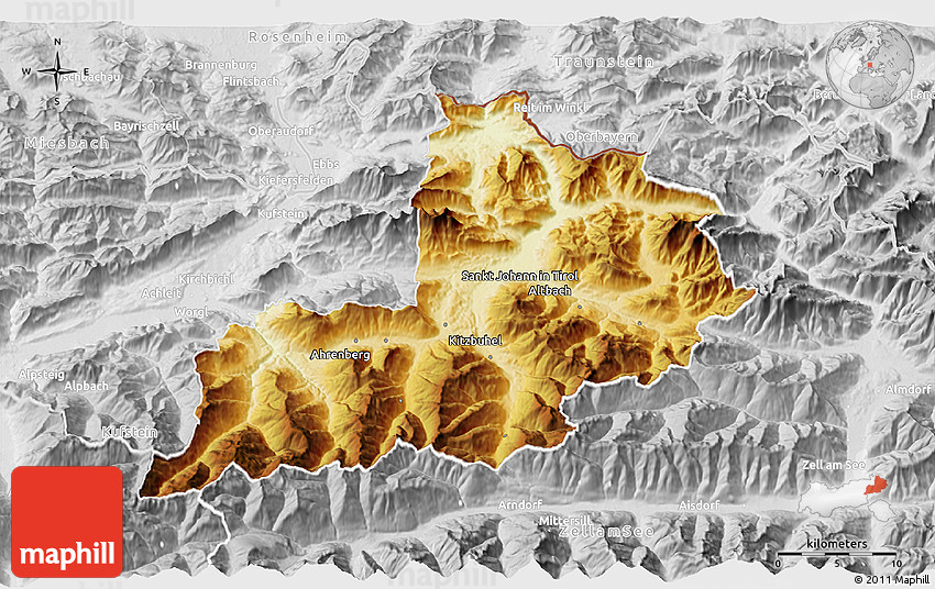 The 3D physical map represents one of several map types and styles available. Look at Kitzbuhel, Tirol, Austria from different perspectives.