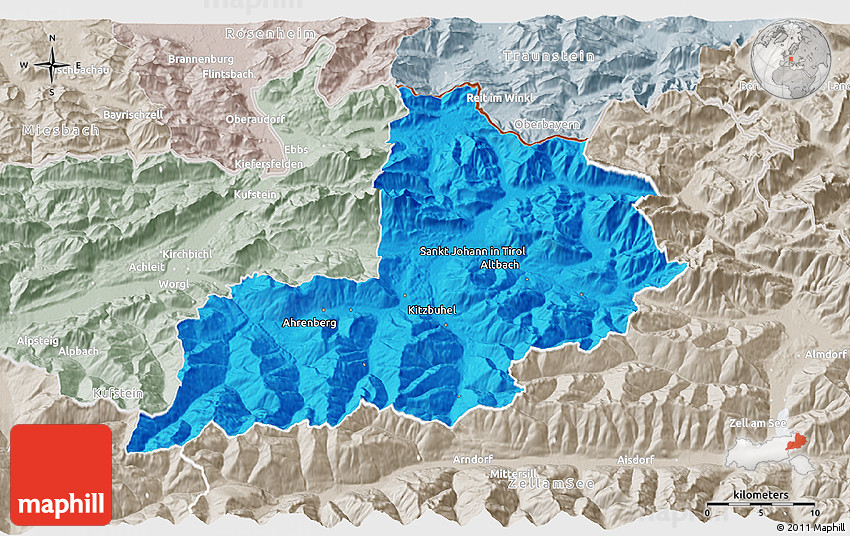 The 3D political map represents one of several map types and styles available. Look at Kitzbuhel, Tirol, Austria from different perspectives.