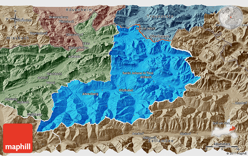 The 3D political map represents one of several map types and styles available. Look at Kitzbuhel, Tirol, Austria from different perspectives.