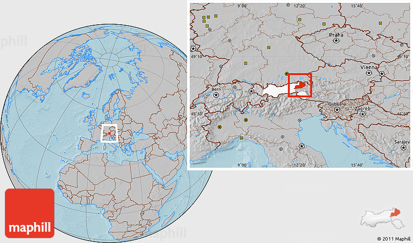 Maphill is a collection of map images. This image combines a gray map with the globe centered on Kitzbuhel. Use the buttons under the image to switch to different map types.