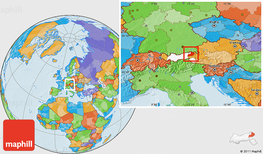 Maphill is a collection of map images. This image combines a political map with the globe centered on Kitzbuhel. Use the buttons under the image to switch to different map types.