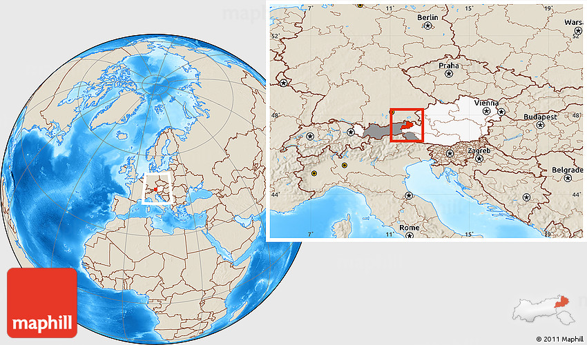Maphill is a collection of map images. This image combines a shaded relief map with the globe centered on Kitzbuhel. Use the buttons under the image to switch to different map types.