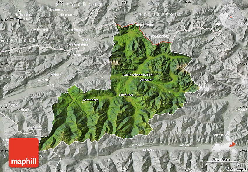 The flat satellite map represents one of several map types and styles available. Look at Kitzbuhel, Tirol, Austria from different perspectives.
