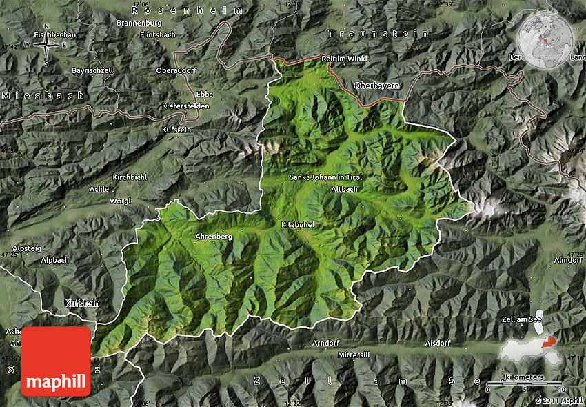 The flat satellite map represents one of several map types and styles available. Look at Kitzbuhel, Tirol, Austria from different perspectives.