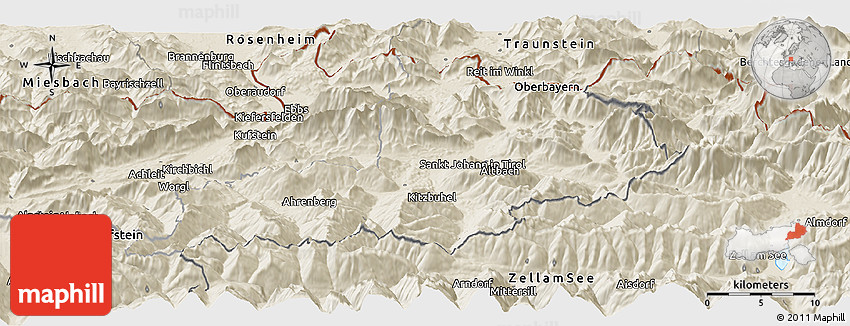The panoramic shaded relief map represents one of several map types and styles available. Look at Kitzbuhel, Tirol, Austria from different perspectives.