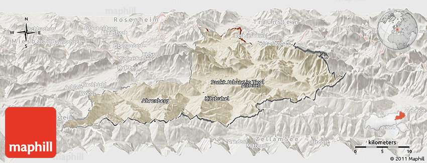 The panoramic shaded relief map represents one of several map types and styles available. Look at Kitzbuhel, Tirol, Austria from different perspectives.