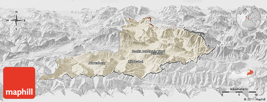 The panoramic shaded relief map represents one of several map types and styles available. Look at Kitzbuhel, Tirol, Austria from different perspectives.