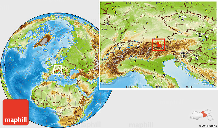 Maphill is a collection of map images. This image combines a physical map with the globe centered on Schwaz. Use the buttons under the image to switch to different map types.