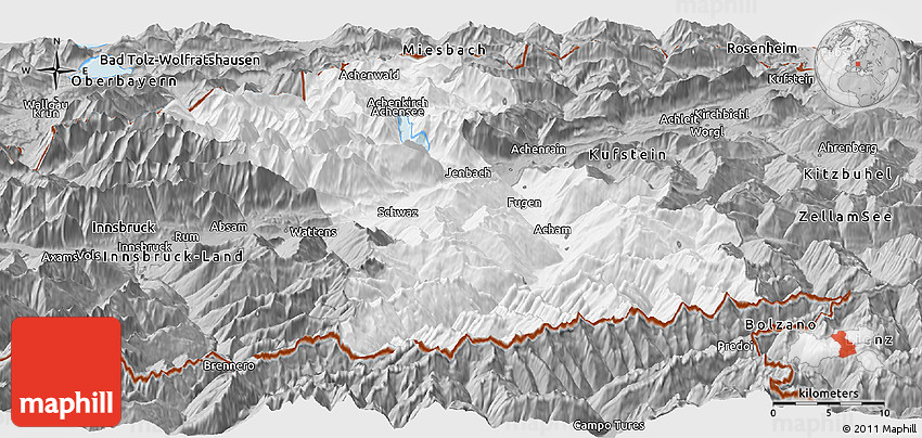 The panoramic gray map represents one of several map types and styles available. Look at Schwaz, Tirol, Austria from different perspectives.