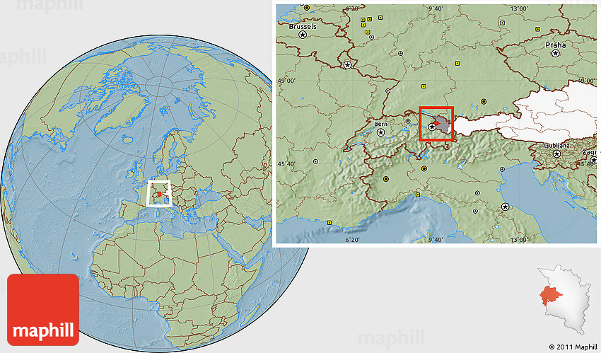 Maphill is a collection of map images. This image combines a savanna style map with the globe centered on Feldkirch. Use the buttons under the image to switch to different map types.
