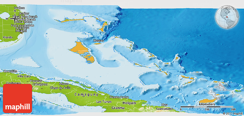 Physical map illustrates the mountains, lowlands, oceans, lakes and rivers and other physical landscape features of The Bahamas. Differences in land elevations relative to the sea level are represented by color.