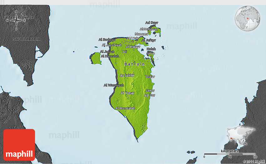 Physical map illustrates the mountains, lowlands, oceans, lakes and rivers and other physical landscape features of Bahrain. Differences in land elevations relative to the sea level are represented by color.