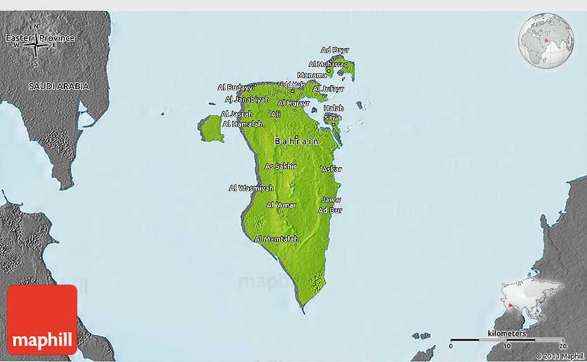 Physical map illustrates the mountains, lowlands, oceans, lakes and rivers and other physical landscape features of Bahrain. Differences in land elevations relative to the sea level are represented by color.