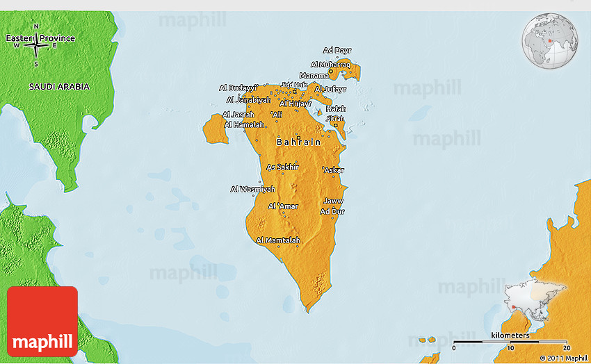 The 3D political shades map represents one of many map types and styles available. Look at Bahrain from different perspectives.