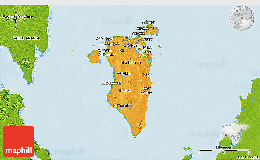 Physical map illustrates the mountains, lowlands, oceans, lakes and rivers and other physical landscape features of Bahrain. Differences in land elevations relative to the sea level are represented by color.