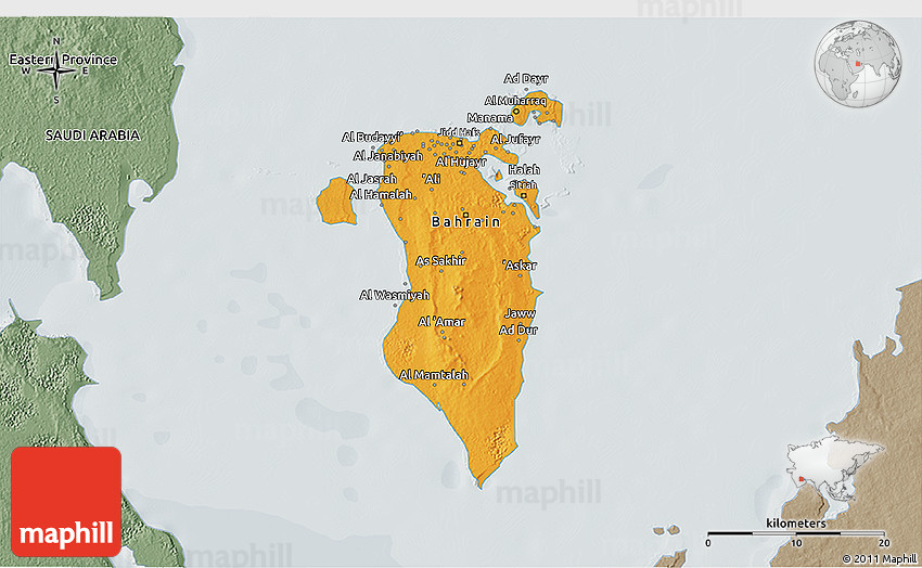 The 3D political shades map represents one of many map types and styles available. Look at Bahrain from different perspectives.