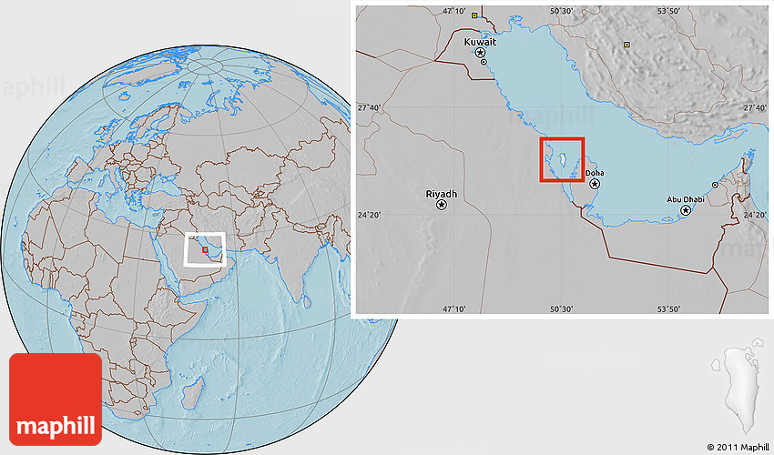 Maphill is a collection of map images. This image combines a satellite map with the globe centered on Bahrain. Use the buttons under the image to switch to different map types.