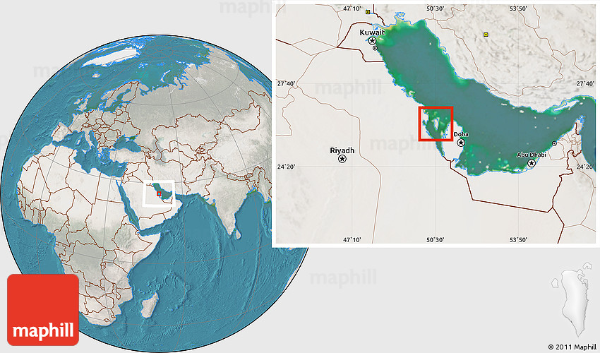 Maphill is a collection of map images. This image combines a satellite map with the globe centered on Bahrain. Use the buttons under the image to switch to different map types.