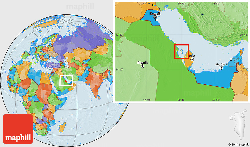 Maphill is a collection of map images. This image combines a satellite map with the globe centered on Bahrain. Use the buttons under the image to switch to different map types.