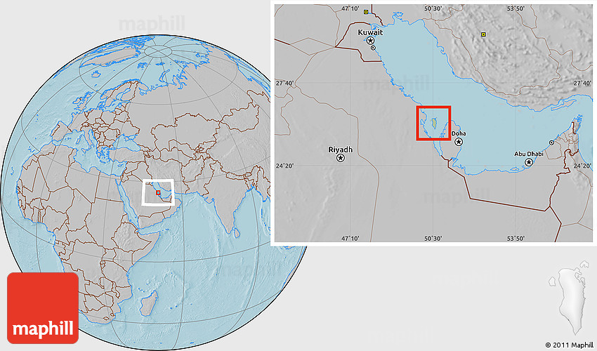 The location map of Bahrain combines two projections: the orthographic azimuthal projection for the globe and the simple geographic projection for the rectangular part of the map. Geographic projection has straight meridians and parallels, each degree of latitude and longitude is the same size over the entire world map.