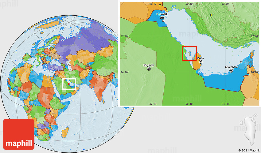 Maphill is a collection of map images. This image combines a savanna style map with the globe centered on Bahrain. Use the buttons under the image to switch to different map types.