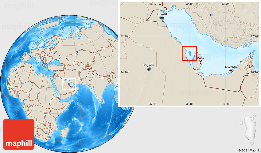 Maphill is a collection of map images. This image combines a savanna style map with the globe centered on Bahrain. Use the buttons under the image to switch to different map types.