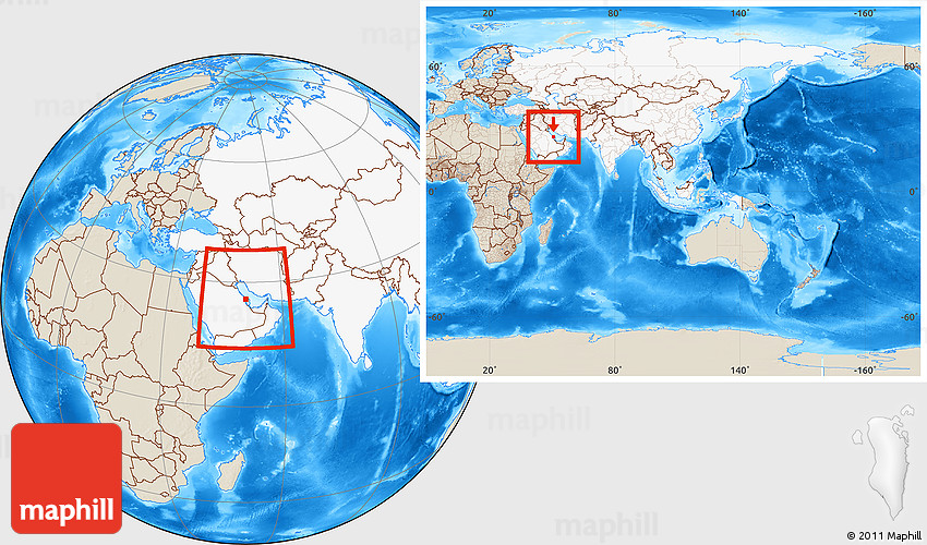 Maphill is a collection of map images. This image combines a shaded relief map with the globe centered on Bahrain. Use the buttons under the image to switch to different map types.