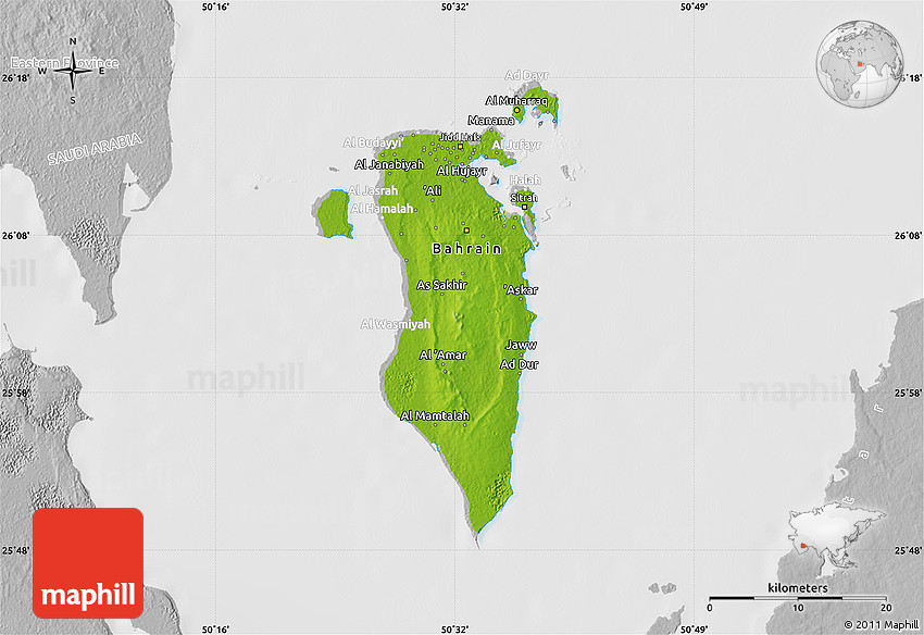 Physical map illustrates the mountains, lowlands, oceans, lakes and rivers and other physical landscape features of Bahrain. Differences in land elevations relative to the sea level are represented by color.