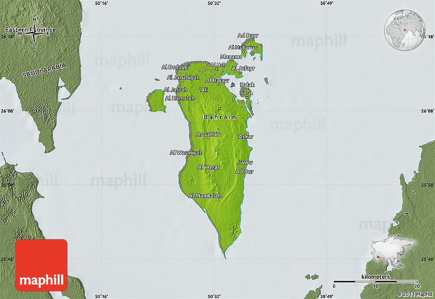Physical map illustrates the mountains, lowlands, oceans, lakes and rivers and other physical landscape features of Bahrain. Differences in land elevations relative to the sea level are represented by color.