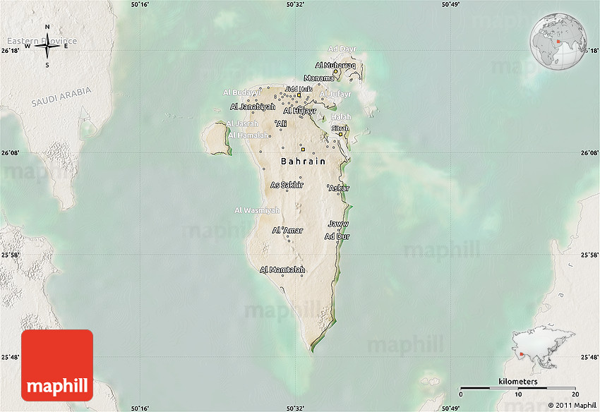 Each map type offers different information and each map style is designed for a different purpose. Read about the styles and map projection used in the above map (Satellite Map of Bahrain, lighten).